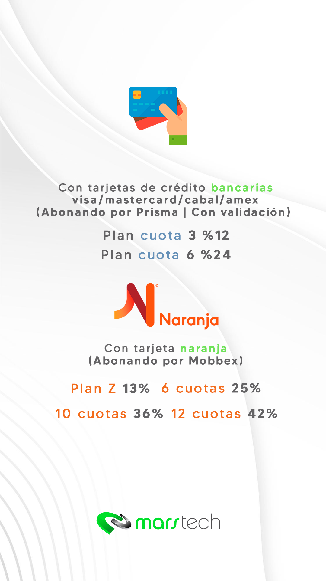 Queremos informarle que las plataformas de pago y pasarelas de pago utilizadas por Marstech SRL están fuera de nuestro control directo. En caso de que estas plataformas denieguen su validación, usted tiene la opción de realizar el pago de forma física en nuestro establecimiento o mediante transferencia bancaria a nuestro alias o CBU.
